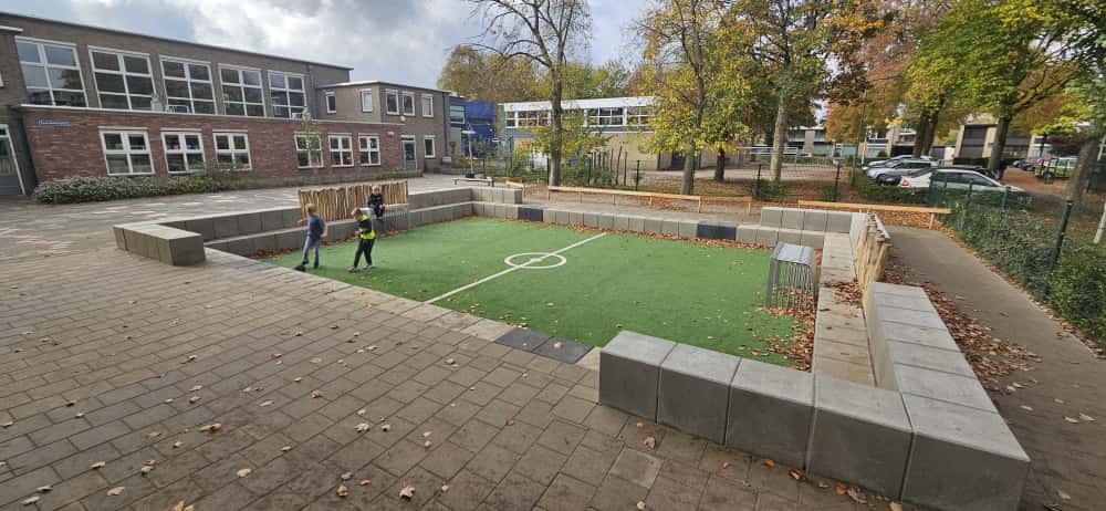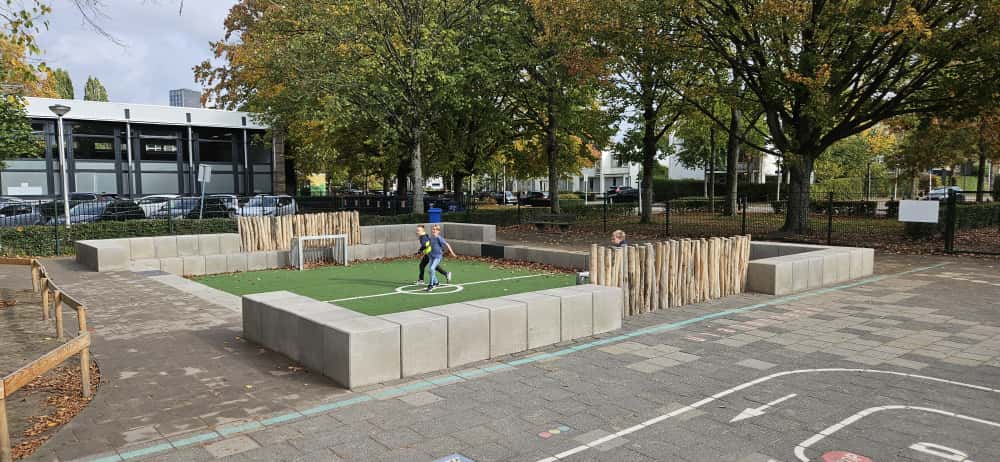 Een voetbalveld is een vast gegeven van veel schoolpleinen. Toch maken positie, hoogteverschillen en inpassing het verschil tussen een dominant speelobject en een plek die in balans is met de rest van het plein.