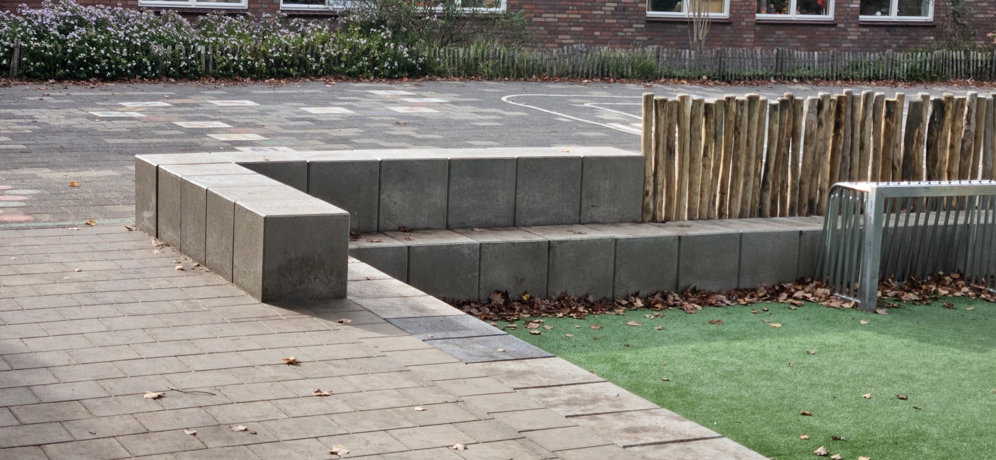 Op veel schoolpleinen staat een voetbalkooi met hoge hekken. Functioneel en duidelijk aanwezig.